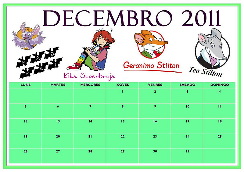 Como para o blogue da nosa biblio fixen un calendario cos protagonistas das novidades que temos na biblio este mes, aproveito para deixarvolo aquí por se a alguén lle interesa.